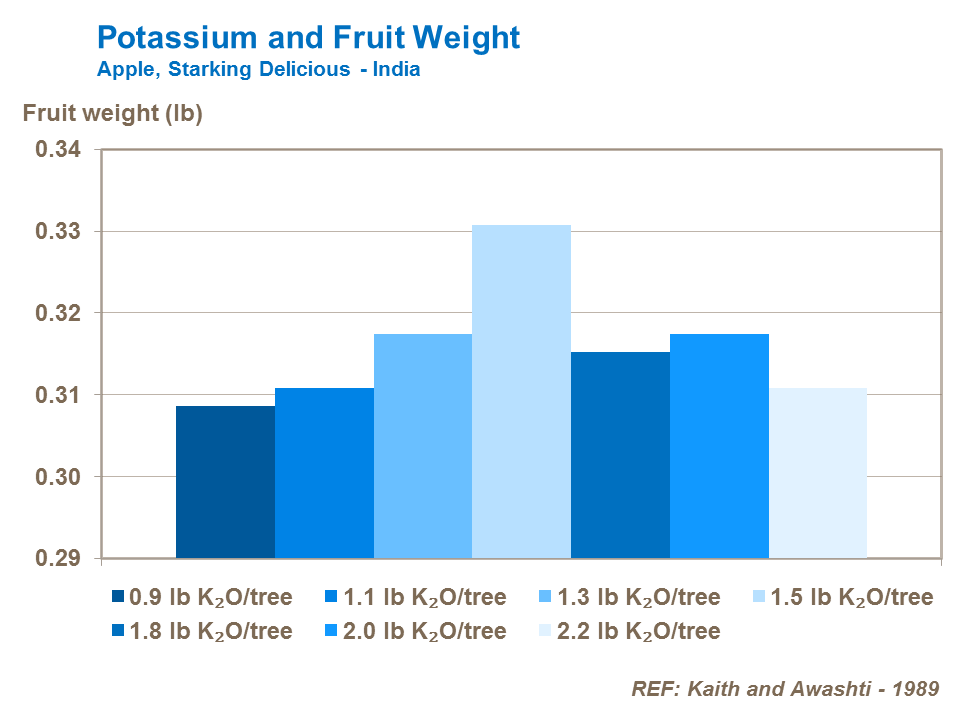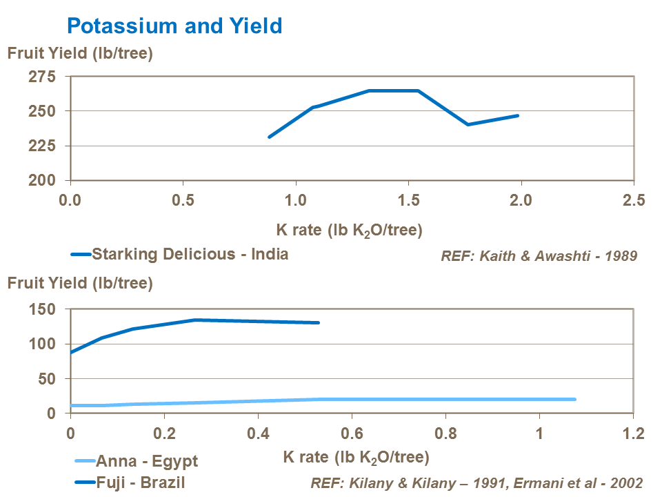 Where supplies are inadequate, potassium yield responses have been recorded following applications of up to 600-700 g/K/tree in low density orchards. Some of this yield increase comes from an increase in fruit weight. However, applications need to be adjusted according to soil potassium levels: where levels are high, high K fertilizer rates may lead to a yield reduction, mainly due to a reduced uptake of other cations (Mg and Ca).