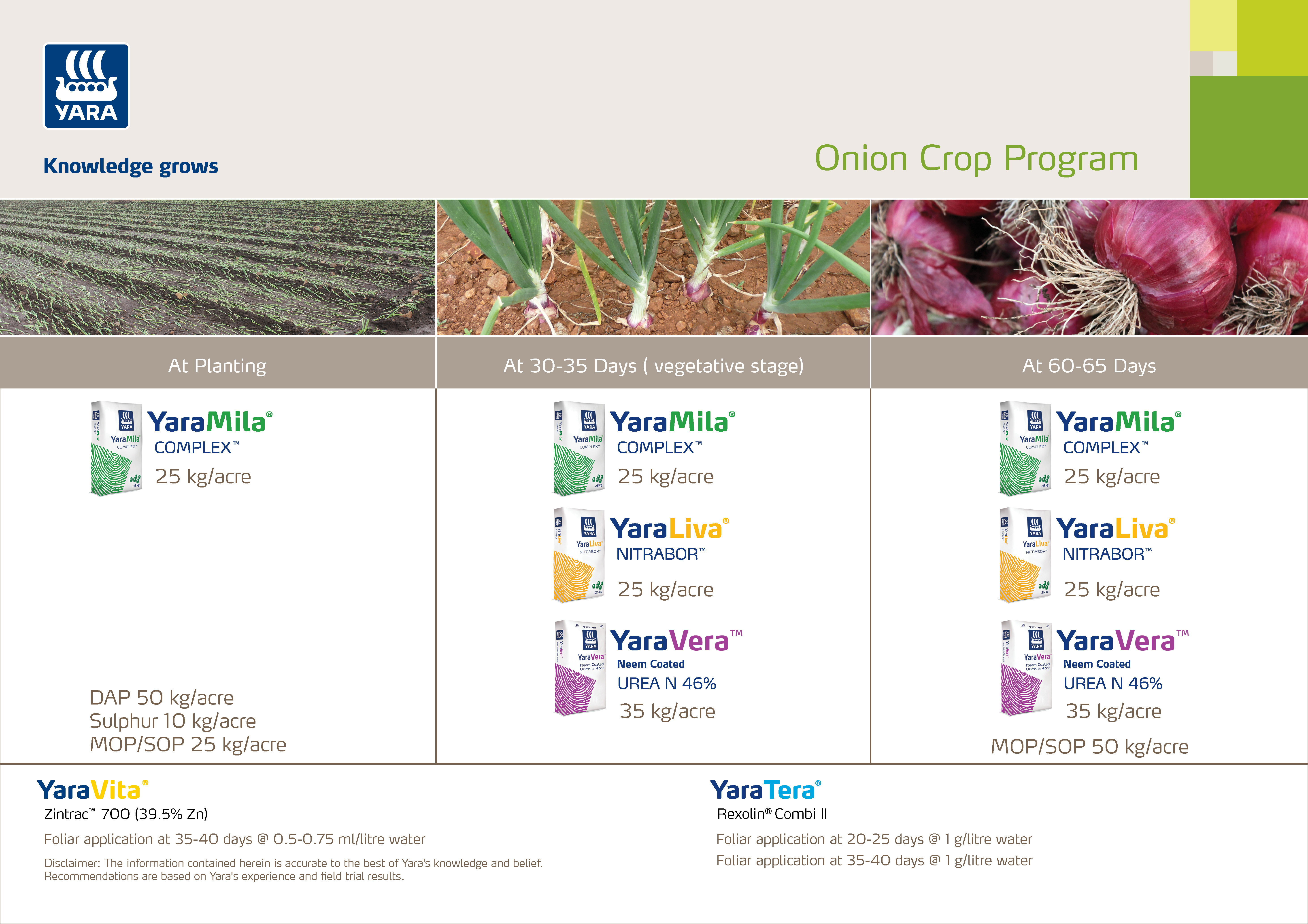 Yara’s fertigation program for onion is based on soil application of YaraMila compound NPK fertilisers and fertigation with YaraTera, YaraLiva as well as foliar application of YaraVita products.