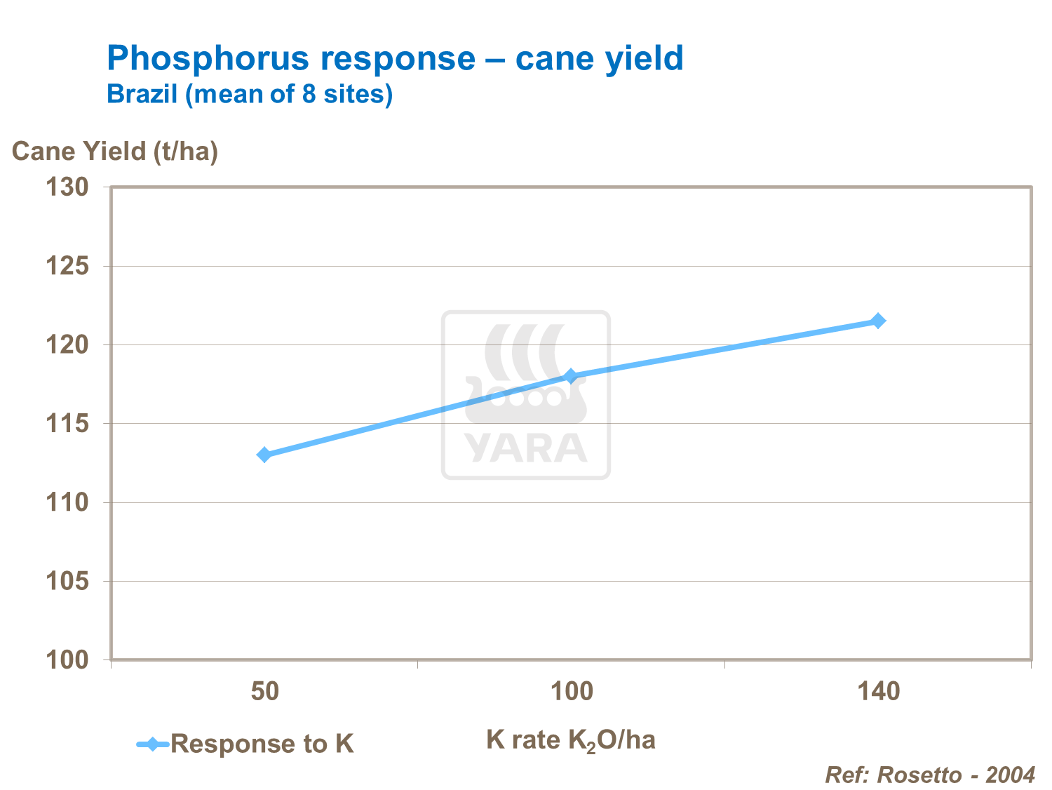 Potassium aids photosynthesis and so is important to productive growth, stronger stalk development with less lodging. Thus like nitrogen, K also boosts strong cane development, long internode growth, wider cane girths and sugarcane yield. Potassium and nitrogen need to be in balance. While N responses can be small, use of potassium alongside N ensures better yields of cane.