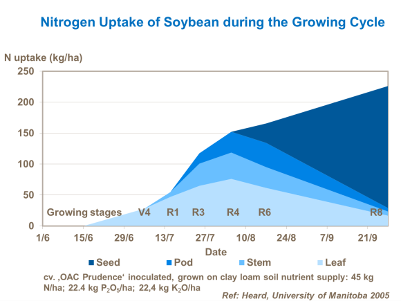 Le soja contient environ 40 % de protéines dans le grain, qui est riche en azote (N) et, par conséquent, les besoins en azote du soja sont élevés.