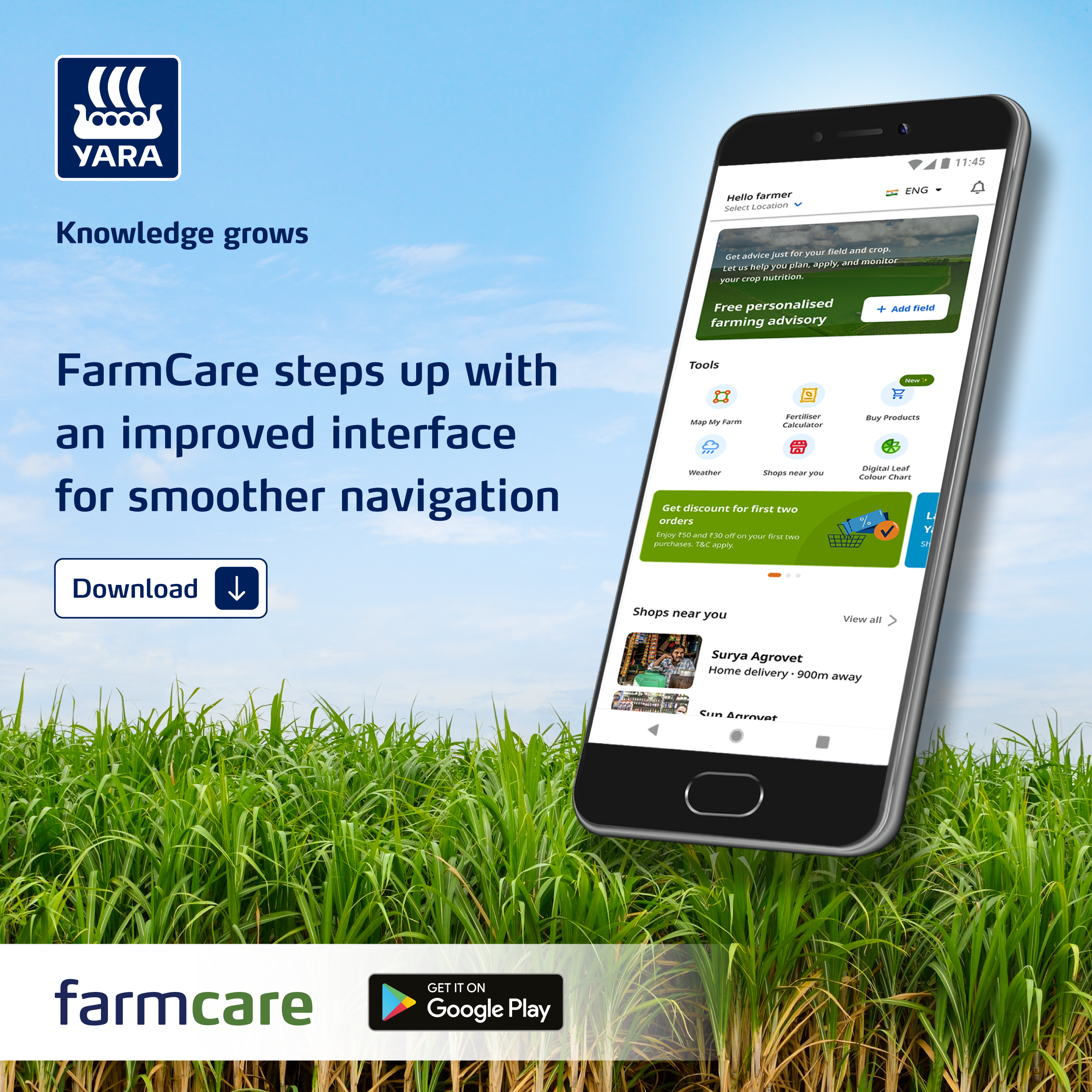 testament to Yara's commitment to providing real-time agricultural solutions and empowering farmers through technological innovation. The enhanced FarmCare app features a user-friendly interface and introduces groundbreaking tools such as "map-my-farm," real-time weather updates, a fertilizer calculator, and a digital leaf colour chart for accurate nitrogen assessment in crops. A noteworthy addition is an integrated marketplace offering Yara product details, store locations, personalized crop insights, and knowledge advisories. With over 4.5 million downloads and 2.2 million registrations, the FarmCare app has become an indispensable resource for 1.3 million active farmers across key states like Uttar Pradesh, Punjab, Bihar, Haryana, and Maharashtra. Providing insights for a diverse range of crops, including wheat, paddy, sugarcane, maize, beans, onions, and cotton, the app empowers farmers to optimize their agricultural practices.